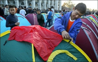 抗议群众在比什凯克中央广场总统府前挥舞着反对党的旗子,高呼“巴基耶夫滚蛋!”、“我们等待改变!”等口号。吉尔吉斯反对派在总统府前搭起了大约150顶帐篷。300多名防暴警察在周边戒备。