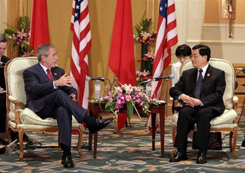 胡锦涛指出,当前,经济全球化带来的机遇和挑战同时上升,影响和平与发展的不稳定不确定因素有所增多。作为利益攸关方和建设性合作者,中美应该就事关世界和平稳定和全人类共同利益的重大问题加强对话,增进互信,深化合作,妥善处理分歧,推动中美建设性合作关系不断向前发展。为此,双方应该坚定不移地推进中美建设性合作关系,坚持从战略高度和长远角度出发,牢牢把握两国关系发展的正确方向,全面推进中美建设性合作关系;妥善处理台湾问题,布什总统和美国政府多次重申坚持一个中国政策、遵守中美三个联合公报、反对“台独”,希望美方恪守承诺,不向“台独”分裂势力发出任何错误信号,以维护中美共同战略利益;加强在亚太地区合作,就亚太事务加强磋商和合作,共同维护和促进该地区和平、稳定、繁荣;推进经贸互利合作,搞好首次中美战略经济对话,充分发挥中美商贸联委会、中美经济联委会等协调机制的作用,推动两国经贸合作更快更好发展;本着双向互利的精神,加强反恐、防扩散、防务、能源、航天、科技、教育、文化、卫生、青年等广泛领域的交流合作,充实中美建设性合作关系的内涵。