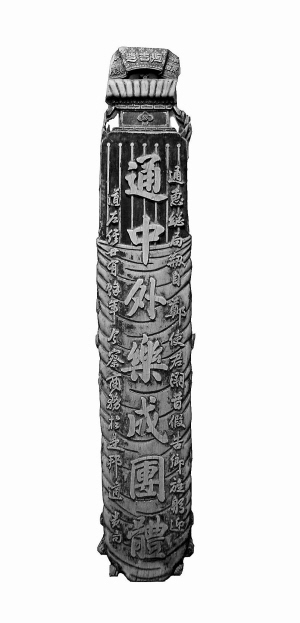 这是一副由木雕制成的上联,左右两侧各有十七个字的说明,联的中间清晰地透出“通中外乐成团体”七个大字。这副对联是什么时间写的,出自什么人之手,这些已无从考据,是否还有下联也不得而知。不过,通惠总局的人士长久保留,并郑重地捐赠给中国华侨历史博物馆,足以看出其重要和珍贵。而联中“通中外乐成团体”,七个大字可以映出,该社团在沟通华侨与当地居民的联系,促进中外友谊方面具有特殊的功能和作用。