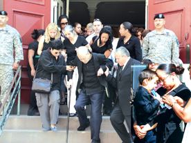 遭受沉痛打击的夏海明的双亲11日显得非常憔悴,脸色苍白。虽然在出殡仪式前,夏海明78岁的父亲夏庭方还向记者表示,心情稍平静了一些。但当覆盖着美国国旗的夏海明棺木在11位军人的护送下,从麦迪臣街29号的维利拉殡仪馆(Venella's Funeral Chapel)送到毗邻的圣詹姆斯教堂时,紧随在后、拄着拐杖、步履沉重的夏庭方虽然一再强忍,但泪水还是无法控制地流了下来。