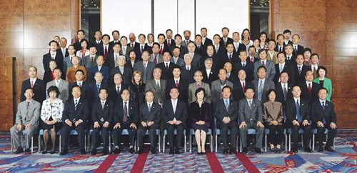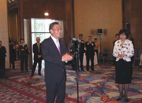 9月1日上午9时,吴邦国委员长与夫人章瑞珍在李姣云总领事陪同下走进宾馆大厅时,受到了在场各界华人代表及中资公司、领馆人员的热烈掌声欢迎。吴邦国亲切地与首排侨领们一一握手,随后,吴邦国委员长和夫人章瑞珍与全体华人华侨、中资公司人员、中国驻圣保罗领馆人员以及留学生代表合影留念。