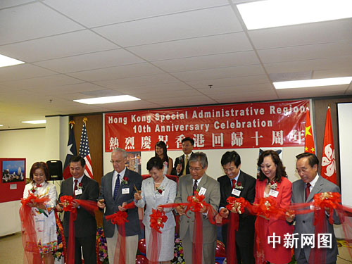中新网7月2日电 据美国《华夏时报》报道,休斯敦香港会馆6月30日在中华文化服务中心举办庆祝香港回归十周年图片展开幕式。美国国会议员武休伯、休斯敦市议员彼德布朗、糖城市议员黄安祥、休斯敦前议员代理市长关振鹏、侨社各界代表及休斯敦总领馆各部门外交官一百多人出席了开幕式。