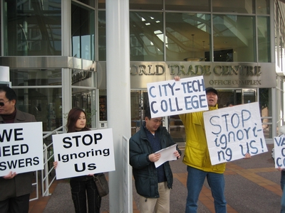 中新网11月3日电 据加拿大《环球华报》报道,1日下午,二十几名城市理工学院(City Tech College)和英皇学院(Kingston College)等私立学院的华裔学生代表,在温哥华市中心加拿大广场前(Canada Place),集会抗议这些私立学院诈财,并要求省当局赔偿。