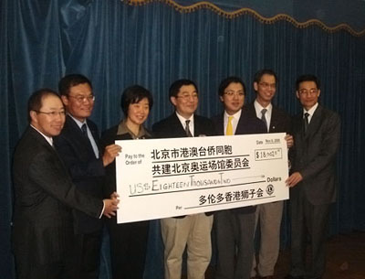 以香港移民为主的多伦多香港狮子会还在介绍会现场捐赠了18002美元的支票,这是继今年3月安省黄江夏云山公所捐赠1万加元奥运捐款后,当地侨团捐赠的第二笔大额奥运捐款。陈小玲总领事、乔卫主任分别代表总领事馆和北京市港澳台侨同胞共建北京奥运场馆委员会接受了该笔捐款。