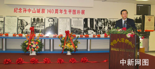 中新网11月13日电 据美国《华夏时报》报道,当地时间11月12日上午11点,休斯敦中国人活动中心人举办“纪念孙中山诞辰140周年生平图片展”剪彩仪式,近百位来自两岸三地的侨团代表出席了开幕式。