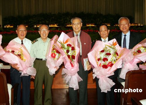 九月十九日,庆祝中国侨联、上海市侨联成立五十周年大会在上海举行,图为上海侨界德高望重的老科学家、上海市侨联顾问吴孟超院士(左二)、严东生院士(中)与老归侨们欢聚一堂,庆祝侨联五十华诞。中新社发 潘索菲 摄