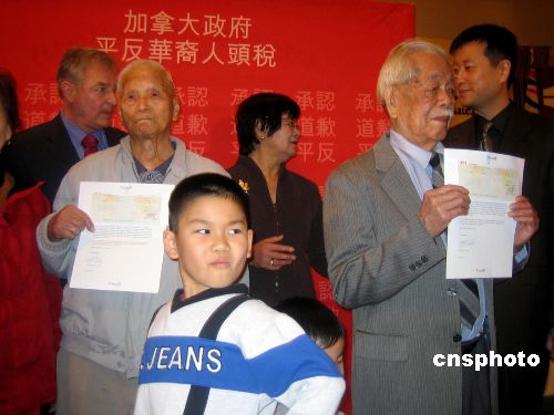 当地时间十月二十日上午,加拿大联邦政府在温哥华举行华裔“人头税”象征性赔偿支票递交仪式,首批五位“人头税”付款人分别获得两万加元的赔偿。加总理哈珀今年六月二十二日在国会就“人头税”问题向华人正式道歉,并决定对“人头税”付款人和遗孀进行赔偿。据悉,全加目前仍然在世的“人头税”受害者已不足三十人。图为九十九岁的关祥国(右持支票凭证者)和九十七岁的孙庆焜领取支票时的情形。中新社发 罗琦 摄