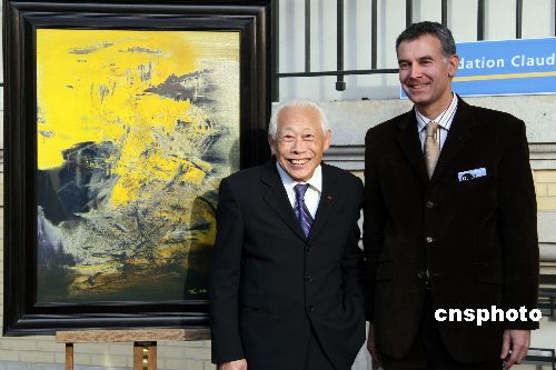 为期五天的巴黎艺术大展当地时间10月30日在巴黎落幕,著名华裔画家赵无极在自己的作品前同观众合影。中新社发 钟诚 摄