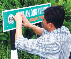 中新网9月26日电 马来西亚北海王裕好路易名风波原来只是一场误会,在威省市政局指示下,发展商承包工友25日冒雨赶工将误置路牌拔起,重新置回王裕好路名的路牌,这意味着引起北海华社哗然及非议的华裔名人路牌风波终告解决。