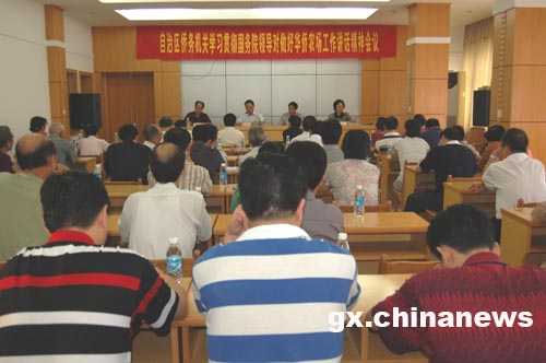 中新网8月14日电 据中新广西网报道,8月11日,广西自治区侨务机关召开侨办、侨联机关全体干部职工、离退休职工代表、华侨学校领导及“五侨”领导参加的会议,广西自治区侨办主任李汉金向与会人员传达国务委员唐家璇对做好华侨农林场工作的重要讲话。