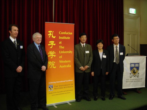 中新网7月3日电 据中国驻澳大利亚大使馆消息:6月26日,西澳大学举行孔子学院新址(位于西澳大学校园克莱尔蒙特区)揭牌仪式。西澳大学校长艾伦·罗伯森教授和浙江大学常务副校长倪明江教授共同为孔子学院新址剪彩。中国驻澳大利亚公使衔教育参赞朱小玉、驻珀斯副总领事阮平和驻澳大利亚大使馆教育处陈宏老师应邀出席了揭牌仪式。