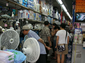 炎热的太阳烤坏了路人,却乐坏了卖电扇、空调的老板。据华埠商家介绍,由于受电路负电量的影响,华埠居家只能选择电扇降温,这些天,华埠的电扇最热卖。(记者李竑)