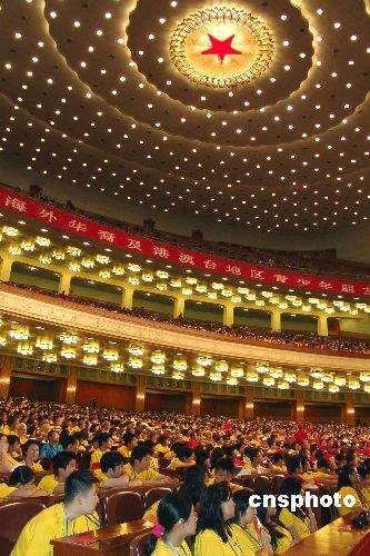 七月十七日,由中国国务院侨务办公室、中国海外交流协会共同主办的“二OO六年海外华裔及港澳台地区青少年中国寻根之旅夏令营”在北京人民大会堂举行盛大的开营仪式。来自世界四十五个国家和港澳台地区近五千名华裔青少年欢聚北京。中新社发 张勤 摄