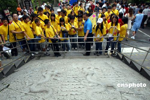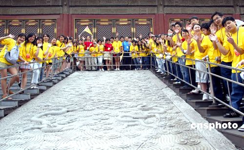 七月十七日,“二OO六年海外华裔及港澳台地区青少年中国寻根之旅夏令营”的营员们在北京故宫博物院参观。此次活动是由中国国务院侨务办公室、中国海外交流协会共同主办的。来自世界四十五个国家和港澳台地区的近五千名华裔青少年参加了该活动。中新社发 张勤 摄