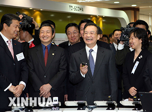 中新网4月12日电 中国信息产业部消息,4月10日,访问韩国的中国总理温家宝参观了SK电讯公司,视察了刚刚建成的TD-SCDMA第三代移动通信试验网,并通过试验网与在北京的中国信息产业部部长王旭东进行了TD-SCDMA视频通话。温家宝特别指出:信息技术不仅是科技的进步,更能沟通人民的心灵。