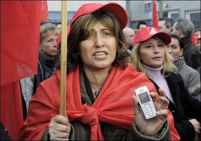 图为诺基亚雇员在Bochum生产基地外面进行抗议游行