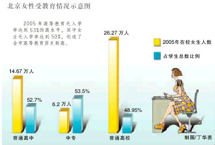 数据显示,近年来,北京市在校女大学生和女研究生比例持续增加。2003年,普通高校在校女大学生人数首次逾越20万人大关,之后逐年增加,到2005年达到26.27万人,占在校大学生总数的48.95%,比2000年提高5.5个百分点;2005年女研究生在读人数达到5.5万人,占在读研究生的33.33%.同时,高等教育毛入学率逐年提高,2005年达到53%的高水平,其中女生毛入学率达到50%,创造了全市高等教育历史新高。