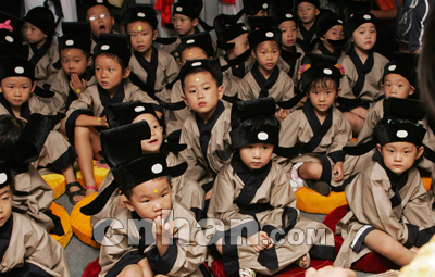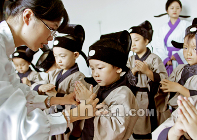 中新网8月15日电 据武汉晨报报道,45名3~8岁的孩子,着古代冠帽和汉服,向孔子像行礼后开始学国学。13日,一家名叫“童学馆”的现代私塾在武汉现身。