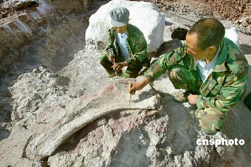 八月二十六日,中科院古脊椎动物与古人类研究所的科研人员,在位于新疆昌吉回族自治州奇台县的恐龙沟,挖掘出一具蜥脚类食草恐龙化石。据现场专家测量,其体长达三十五米左右,与一九八七年,距该挖掘点一百多米之外的山上挖掘出土的恐龙同为马门溪龙,但比一九八七年挖掘的恐龙还要长五米,成为名副其实的“亚洲第一龙”,同时该恐龙的脖子长约十五米,是迄今为止世界上脖子最长的恐龙。中新社发 刘新 摄