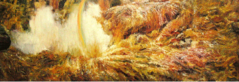 “风在吼,马在啸,黄河在咆哮……”,随着曲调进入高潮,周昌新再也按耐不住心中的激情,11点30分,他拿起画笔,蘸上颜料,开始创作宏篇巨制之作---《中华魂》。大片大片的油彩在画布上流溢、驰骋;在情绪激动的高潮,他甚至什么都不想,只管用画笔在画布上疯狂地涂抹颜料,任意倾泻他像黄河浪涛一样汹涌澎湃的激情。他已不再参考写生、草图或者照片,而是完全根据自己心中的黄河来创作,根据自己在壶口瀑布写生时刻的亲身感受和鲜活印象来创作。时而土黄色、时而棕色、时而白色、红色……。