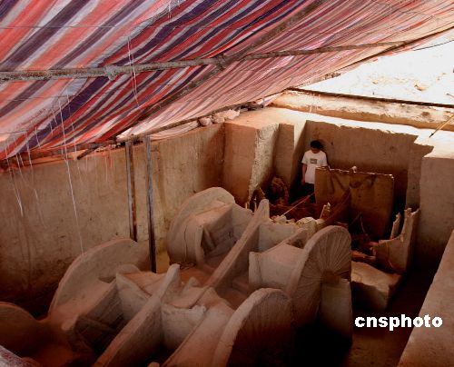 记者在发掘现场看到,该车马坑呈长方型,东西长六点七米,南北宽二点六米,坑深二米,双轮独辕。坑中有三车六马,车西马东,均为辕东轮西前后依次排列,六匹马叠压放置,车和马中间有一道高约一米,宽零点四米的隔梁。三辆车车身布满暗红色漆,车的辐条、车辕、围栏等残留有漆皮,马骨的痕迹清晰可见。