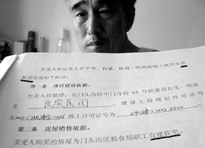 被告律师称,在购房时双方签订的合同中,第二条“房屋销售依据”一项中就有规定:“买受人购买的房屋为门头沟区粮食局职工自建住宅。”被告律师还向法庭提供了支持其“自建房”一说的相关证据,其中包括一份规划部门的文件。该文件中提到,将中门寺街63号院的饲料加工厂改建为良实花园住宅区,目的是“解决粮食系统中低收入职工的住房”。