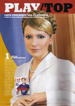 在6月刊波兰版《花花公子》最感兴趣的10个人和事件中,季莫申科力压美国女演员奥贝特、澳大利亚女歌星伊姆布鲁丽娅、宝马推出最新款BMW M6、无线通信上网、空客A380首飞等名人和要事,荣登榜首。杂志还刊登了季莫申科留着辫子、穿浅色商务装的大幅照片,上有她的花体签名。