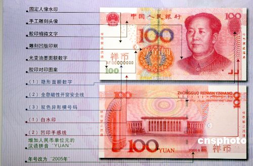 2005年版第五套人民币100元纸币规格、主景图案、主色调、“中国人民银行”行名和汉语拼音行名、面额数字、花卉图案、国徽、盲文面额标记、民族文字等票面特征,固定人像水印、手工雕刻头像、胶印微缩文字、雕刻凹版印刷等防伪特征,均与现行流通的1999年版的第五套人民币100元纸币相同。