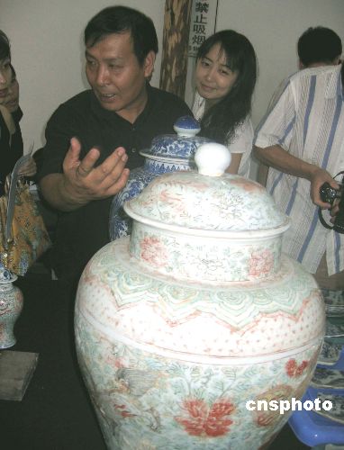 北京考古人员最近在国家体育场等八处奥运场馆工地发现并发掘清理了四百五十余处从西汉至明清时期的古墓,出土了大批珍贵文物,其中重要文物达两千余件。图为考古专家在介绍一件从奥运一期工程工地出土的五彩大罐,这件五彩大罐的年代应为康熙时期随葬用品,其体量之大在全国此前的考古发掘中都很罕见。作者:吴庆才
