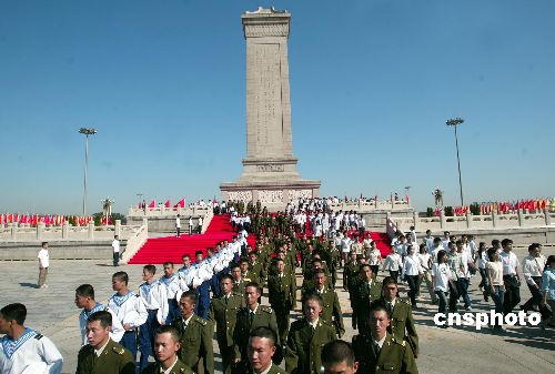 上午九时整,天安门广场正北面的红地毯区,中国共产党和国家领导人胡锦涛、吴邦国、温家宝、贾庆林、曾庆红、黄菊、吴官正、李长春、罗干等九位中央政治局常委并排站立。他们背后除了其他的党和国家领导人外,还有各界代表十个方阵共一万人肃穆站立。