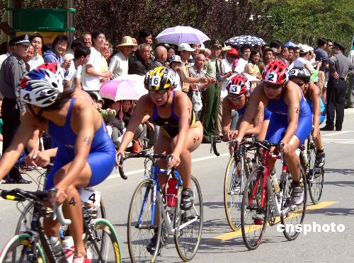 9月4日,全国十运会铁人三项赛在江苏徐州开赛。由于铁人三项第一次被列入全运会正式比赛项目,并且设有男子个人及女子个人两枚金牌,因而得到各省市、自治区行业体协的高度重视。参加今日铁人三项比赛的19支代表队分别是安徽、澳门、福建、甘肃、广东、广西、航天体协、河北、河南、黑龙江、江苏、江西、辽宁、山东、山西、上海、香港、云南、解放军。图为女子组的自行车比赛正在紧张角逐中。 作者:万庆咏