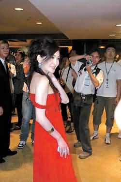 金喜善、曹颖、瞿颖、黄奕、袁立等众明星依次出场亮相。成龙和宁静手牵手出场当然是最风光的一幕,一位硬汉和一位美女成为现场最抢眼的一景。一身性感红色衣裙的温碧霞姗姗来迟,面对记者的相机,温碧霞扭动腰身,频露微笑,显得风情万种。(张学军)