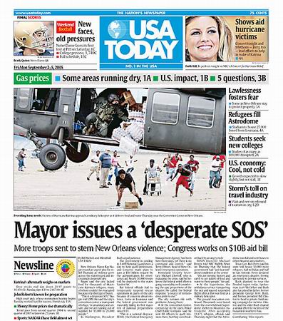中新网9月5日电 “卡特里娜”飓风重创美国成为世界各大媒体的焦点,美国以及国外媒体均在头版对这起事件进行了大篇幅报道。(春风)