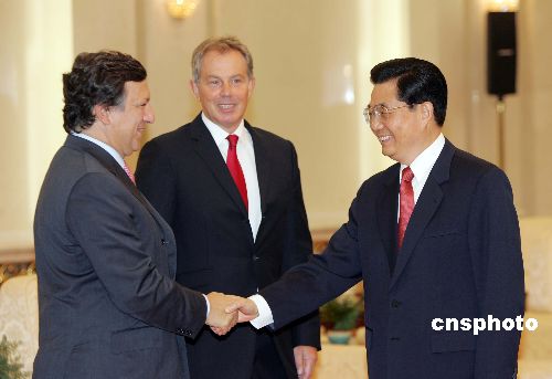 中新社北京九月五日电 (记者 孙宇挺)中国国家主席胡锦涛今天上午在人民大会堂会见了来华出席第八次中欧领导人会晤并进行正式访问的欧盟轮值主席国英国首相布莱尔、欧盟委员会主席巴罗佐和欧盟理事会秘书长索拉纳。