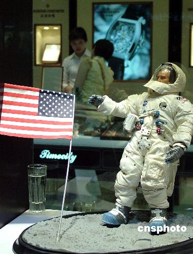 9月2日,上海一家高档手表店出售美国宇船员专用手表,并用造型逼真的宇航员模型放在橱窗为其作宣传,显示出其手表质量做工优质精良。作者:井韦