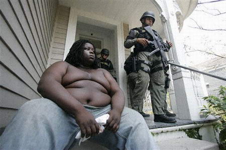 2005年9月5日,一个抢劫小分队闯进今年23岁的新奥尔良居民列昂纳多·托马斯的家中,将家中值钱的财物洗劫一空。邻居们报告称,“卡特丽娜”到来之时,这帮不法之徒暂时躲在了别的居民家中,飓风过后,他们赖在那里不走。托马斯的家人向当局证明房子是他们的,可当局找出种种理由推辞不管。伤心的托马斯坐在自家门前哭泣。