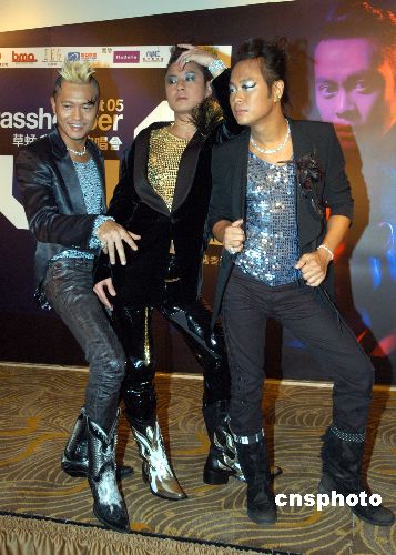 香港乐坛组合《草蜢》9月6日在香港举行记者会,正式宣布在10月20、21日晚假红馆举行“草蜢我们的演唱会”。《草蜢》三子苏志威、蔡一杰、蔡一智(左起)以“妖野”前卫的打扮与传媒会面。作者:邓庆乐