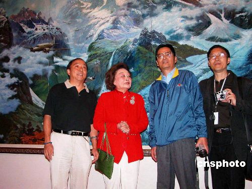 美国著名华裔社会活动家、飞虎队陈纳德将军的夫人陈香梅女士,九月七日参观了由云南省政协一批知名人士策划并创作的大型系列油画《碧雪千秋》。陈香梅在谈到胡锦涛主席在纪念抗战六十周年大会上的讲话,以及陈纳德将军被列入抗日英雄谱时,陈香梅说,我非常高兴飞虎队和陈纳德将军的功绩得到了充分的肯定。这说明中美两国人民是非常友善的,中美两国是朋友。图为陈香梅女士在系列作品之一《驼峰飞行》前留影。作者:纳家骅