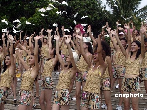 正在海南三亚参加“2005年新丝路中国模特大赛总决赛”的佳丽,九月初来到风光秀丽的南山风景区游览拍摄,图为参赛佳丽兴高采烈放飞百只白鸽。作者:钱兴强