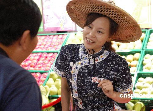 台湾秋季水果为主题的(台湾)“好又多”中国大陆连锁店水果展台,二00五年九月八日在北京中国展览中心举办的“第十二届亚太零售商大会暨中国国际商品博览会”上,以果品种类繁多博得观众好评。图为著台湾装的水果小姐,请观众品尝“番石榴、莲雾、杨桃、文旦等宝岛水果。前台湾“好又多”总部在中国大陆刚好设立了一百家水果连锁店,台湾水果在大陆越来越大畅销。作者:邹宪