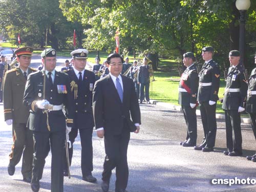 9月8日,加拿大总督克拉克森在总督府举行盛大仪式,欢迎中国国家主席胡锦涛对加拿大进行国事访问。图为胡锦涛主席检阅仪仗队。中新社记者:吕振亚