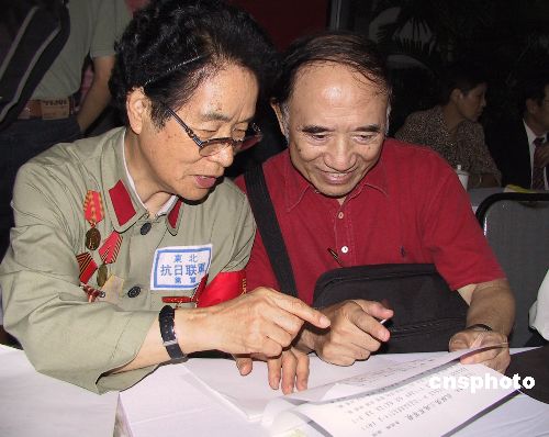 在见面会上,两位老人最引人注意,他们身着东北抗日联军的军服,衣服上披着勋章,与台湾老战士轻声哼唱着抗战歌曲。抗战歌曲把他们又带回了那段烽火历史,传播着他们共同的心声。