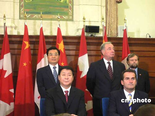 图:胡锦涛与加总理马丁出席合作项目签字仪式