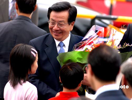 曾庆红满面笑容走出汽车,与迎上前的香港特区行政长官曾荫权热烈握手,他接过两位香港少男少女献上的鲜花,张开双臂同孩子们拥抱。随后,曾庆红与其他迎候人员一一握手。
