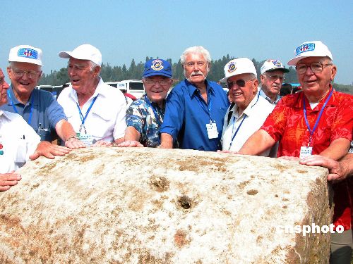 | 九月十日,到中国参加纪念抗战胜利六十周年活动的二战美国老兵重回故地,参观了当年奋战过的地方。六十多年,以陈纳德将军为首的美国“飞虎队”即中国空军美国志愿援华航空队在中国英勇抗击日本侵略军。位于今日昆明市郊的呈贡机场,是当时“飞虎队”主要的空军基地之一,机场南北长三千米,东西宽一千米,当年因为没有压路机,中国民工只能用石碾子压制飞机跑道,其中最大的石碾子高一点八米,重五吨。图为幸存的“飞虎队”老兵们手摸石碾子,追忆当年的峥嵘岁月。 作者:王超