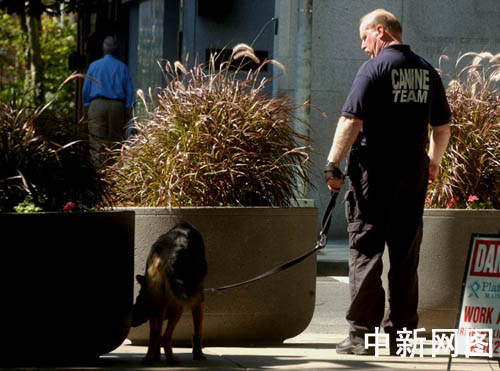 九月十日,美国纪念九.一一事件四周年的前日,保安人员牵着警犬在街头巡逻。作者 贾国荣
