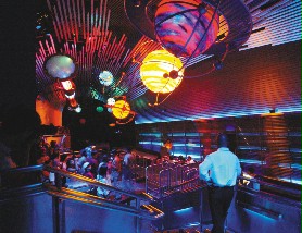 坐上你的太空舱,拿着你的太空枪,和太空敌人来一场雷射战!据说打到山洞口附近的分数最高,还有命中率愈高,分数也愈高,成绩就显示在你座位前的计分板上。对了,不要只会向前走,座位上有摇杆,像打电动玩具一样,摇杆向右,太空舱就向右转,可以360度旋转,机动性很高。据说目前最高纪录有人得了十几万分,破纪录者,迪士尼有赏哦!