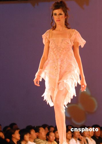 来自英国的著名服装设计师桑德拉·罗德斯女士高级女装展演,九月十一日晚在大连举行,桑德拉·罗德斯女士的设计一直延续着透明光亮的风格,极有创造性,浪漫、夸张且优美、大胆且娇柔。图为展演结束后桑德拉·罗德斯女士(左二)接受中国观众的鲜花祝贺。作者:张勤