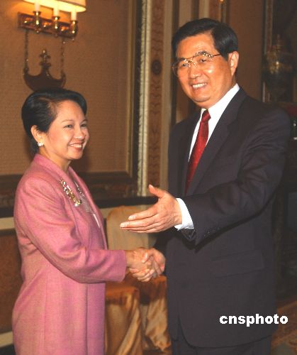 九月十三日抵达美国纽约的中国国家主席胡锦涛,在下榻的华尔道夫酒店会见菲律宾总统阿罗约。作者:贾国荣