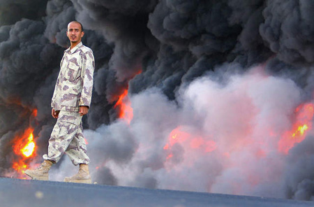 一名伊拉克居民从正在燃烧的石油管道旁走过